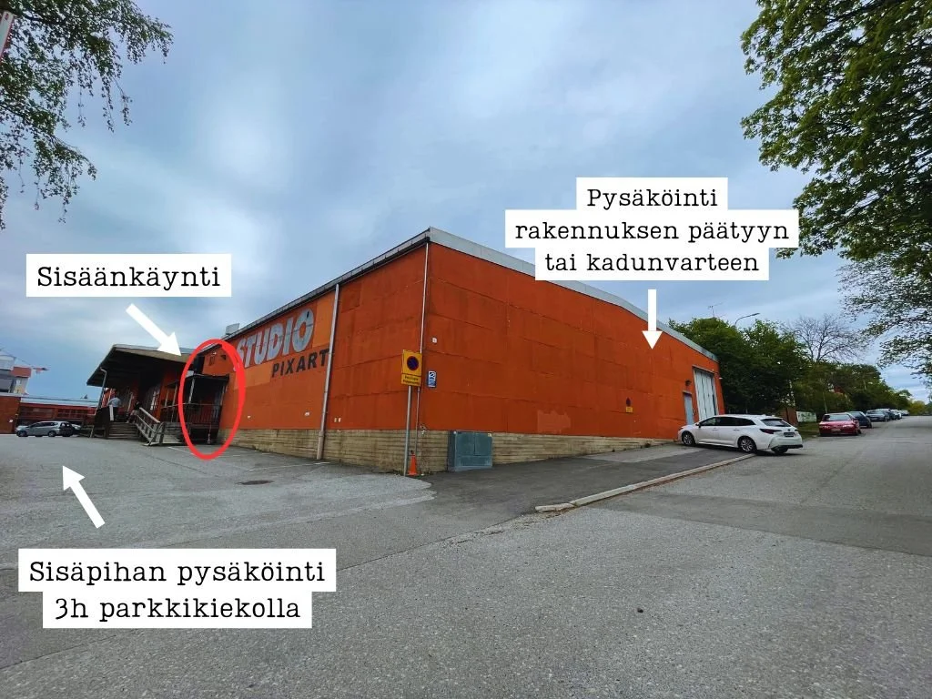 Studion osoite on Tarkk’ampujankatu 1, 20540 Turku – ihan TYKS:n & Kupittaan rautatieaseman lähellä. Studiolle on hyvät kulkuyhteydet Fölillä. Lähikatujen varrella on ilmaisia parkkipaikkoja ja rakennuksen oikeaan päätyyn Tarkk’ampujankadun puolelle voi pysäköidä auton vinoparkkiin rakennuksen seinää vasten (seinässä on kyltti, joka kieltää pysäköinnin studion lastausalueelle, mutta tanssijat voivat pysäköidä autonsa siihen tuntien ajaksi). Myös sisäpihalle voi pysäköidä merkityille paikoille 3h parkkikiekolla. Rakennuksen seinässä lukee isolla “Studio Pixart”. Studion sisäänkäynti löytyy sisäpihan puolelta – oikeanpuolimmaisin ovi Tarkk’ampujankadun suunnasta katsottaessa.
